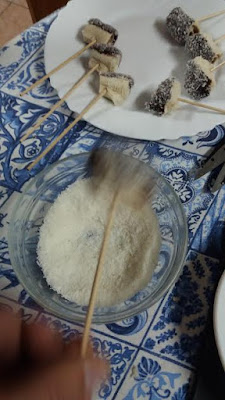 Passe as tortas no chocolate derretido e depois no côco e disponha num recipiente a seu gosto.